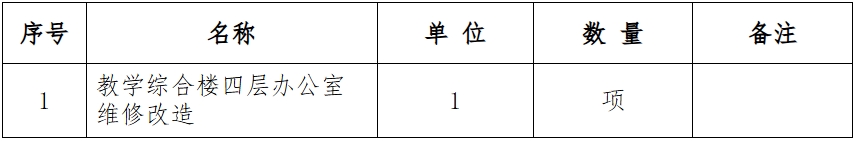 2.采购范围:本工程为beat365官方网站教学综合楼四层办公室维修改造工程,包括以下内容:房间隔墙设置、办公室门安装、内墙涂料、地砖维修、吊顶维修、线路灯具安装等。具体报价范围、采购范围及所应达到的具体要求,以本谈判文件中商务、技术和服务的相应规定为准。