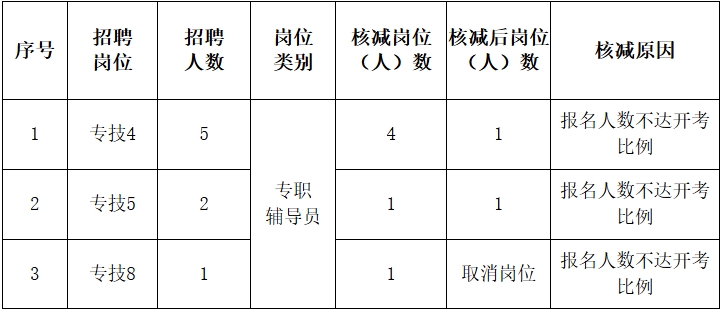 按照《beat365官方网站2019年公开招聘工作人员公告》要求 “岗位资格审查合格人数与拟招聘人数原则上应达3:1以上方可开考,报名人数不达该比例的招聘岗位,按规定的比例相应核减岗位,如减少到1名仍达不到3:1的岗位,原则上取消招聘岗位,并在发布公告的同一网站发布补充公告,同时负责告知被取消岗位的报名人员”,根据报名情况,经学院公开招聘领导组研究,决定核减部分岗位(人)数。现就相关事宜公告如下: