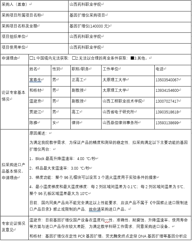 山西药科职业学基因扩增仪采购项目进口产品专家论证意见公示