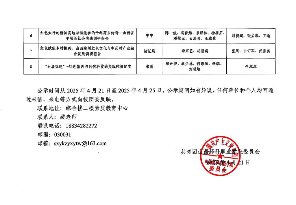 关于beat3652025年第十九届“挑战杯”山西省大学生课外学术科技作品竞赛拟推荐红色专项活动作品的公示