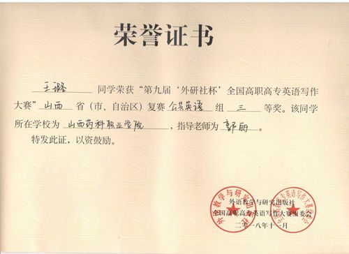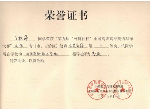 近日,beat365在“第九届‘外研社杯’全国高职高专英语写作大赛”山西省复赛中喜获佳绩,李姝老师指导的17级药学系王敏泽同学荣获一等奖,郭丽老师指导的17级药学系王璐同学荣获三等奖。