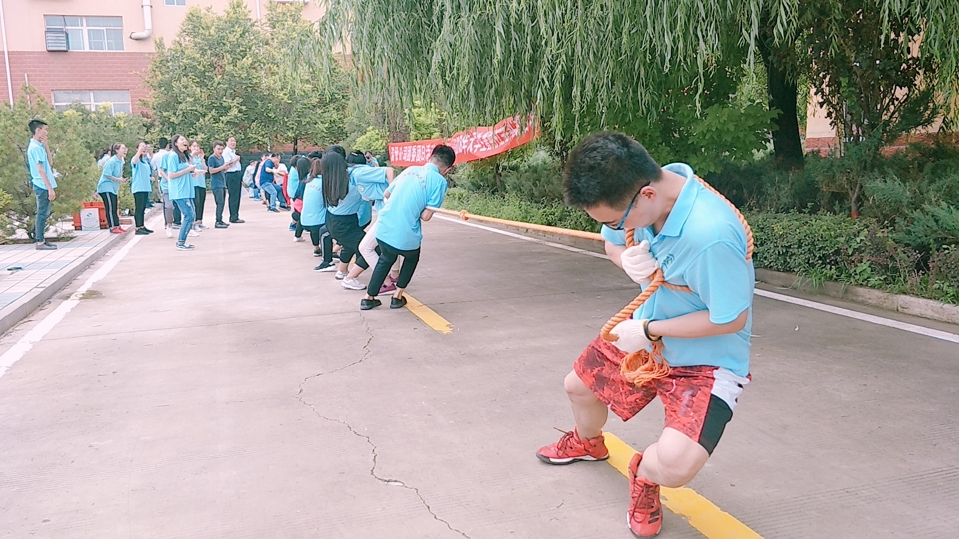 "一二,加油!一二,加油!..."阵阵加油声从宗银公司场地传来!只见由实践团队员和晋银公司职工组成的两个队伍正在如火如荼的进行拔河比赛,场上的队员奋勇争先,斗志昂扬,场下的队友们鼓劲呐喊,声声激昂。7月13日下午,实践队和晋银公司联合开展趣味运动会。活动中既有拔河这样的团队竞技项目,也有一鼓作气、摸石过河、螃蟹赛跑这样的趣味活动。各项比赛的角逐都精彩激烈,肆意挥洒,有的摸爬滚打,妙趣横生。大家都在尽情享受着运动带来的快乐,在愉快的气氛中交流感情、增进友谊。实践队员还与晋银公司职工在刁泉矿场进行了一场篮球友谊赛。队员们个个雄姿英发,奋力拼搏。利落的抢球、迅速的换场、潇洒的投篮,紧张激烈,难解难分。由实践队员组成的拉拉队员也热情高涨,喊着响亮的口号加油助威。让双方友谊在激烈的比赛中升温加热。