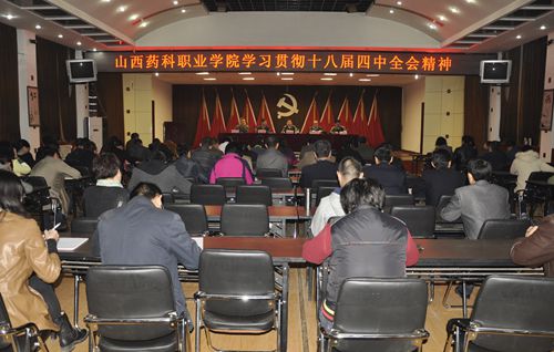 他要求,全院各级党组织和各部门、单位要深入开展四中全会精神的学习、宣传、贯彻。一要在全院迅速掀起学习四中全会精神的热潮。各总支支部书记、部门单位负责人要先学一步、学深一步,学透弄懂、融会贯通;各部门单位要创新形式、载体、平台,全面组织好本部门、本单位学习宣传活动,以“抓铁有痕、踏石留印”的实干劲头,把会议精神理解透、贯彻好、落到实处,在全院上下形成学习、宣传、贯彻全会精神的浓厚氛围。切实把思想和行动统一到习近平总书记重要讲话精神上来,统一到《决定》作出的重大决策部署上来;二要增强法治意识,树立法治观念。广大师生要不断提高自身懂法水平和守法意识,所有党员干部要快速学会用法治思维做决策、用法治理念来理事,着力在全院营造守法光荣、违法可耻的校园氛围,使全体师生都成为社会主义法治的忠实崇尚者、自觉遵守者、坚定捍卫者,为开创山西“净化政治生态、实现弊革风清,重塑山西形象、促进富民强省”新局面做贡献;三要把依法治校摆在更加突出的位置。要增强法治意识,形成依法治校、民主治校的制度体系和工作格局。要以《高等教育法》和《关于坚持和完善普通高等学校党委领导下的校长负责制的实施意见》等为依据,以学院章程制定与建设为核心,进一步完善和推行“党委领导、校长负责、教授治学、民主管理”的现代大学制度。按照四中全会的要求和办学需要不断完善各项规章制度,努力提高依法治校、依法办学水平;四要组织好四中全会精神进教材、进课堂工作。有关职能部门和思政课全体老师要加强对四中全会精神的理论研究和系统阐释,主动解读全会精神,积极推动四中全会精神进教材、进课堂、进头脑工作。要结合社会主义核心价值观的学习践行,大力推进道德教育与法制教育,促进学院的“人才培养、科学研究、服务社会、文化传承与创新”取得更大成绩。