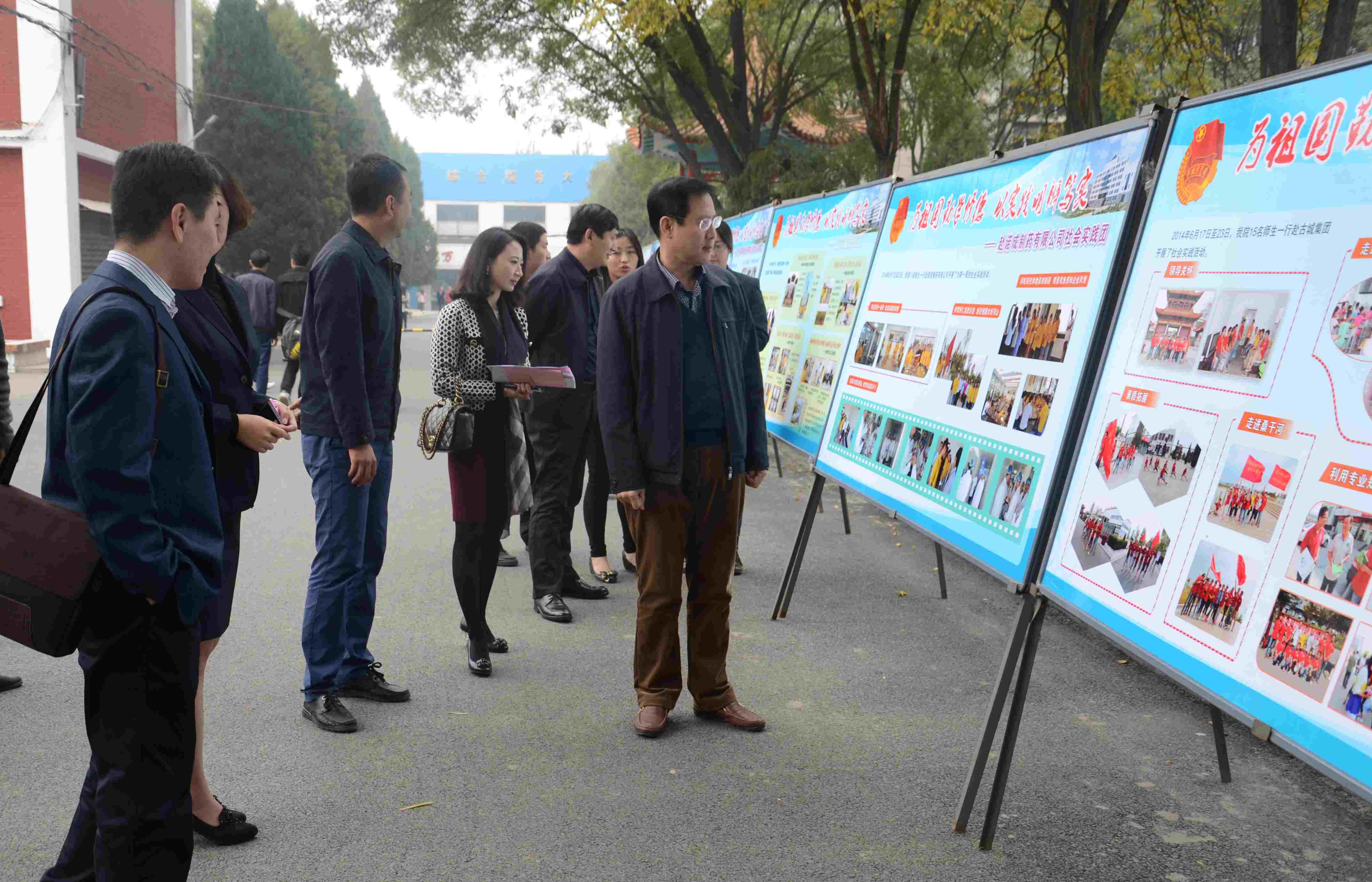 图为院领导和嘉宾观看2014年大学生暑期社会实践成果展示