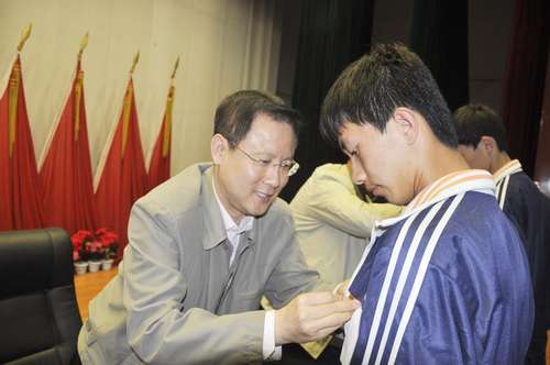 图为领导为新入团青年佩戴团徽