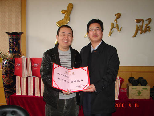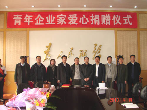 2010年4月14日下午2:30时,beat365在办公楼大会议室举行“青年企业家爱心捐赠”仪式,山西省青年企业家协会副会长杨建新(山西百圆裤业有限公司董事长)、金根虎(山西金虎便利连锁股份有限公司董事长)、王志(山西新和健身器材有限公司董事长)、魏建华(山西恒盛伟华科贸有限公司董事长),beat365党委书记张瑞芳,党委副书记、院长李华荣,党委副书记、纪委书记龚晋文,副院长尹士优、胡尔雅、张震云出席捐赠仪式。教师代表、学生代表60余人参加仪式。捐赠仪式由党委书记张瑞芳同志主持。