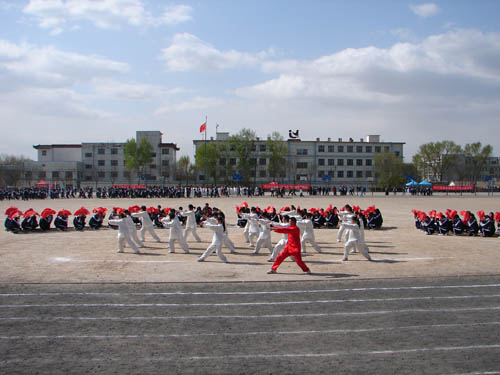 裁判员代表贾一波老师和运动员代表聂晓峰同学分别向大会宣誓。随后由生物制药工程系表演的广播体操、药品经济贸易系表演的舞动青春、中药系表演的太极拳将开幕式的气氛推向了高潮。