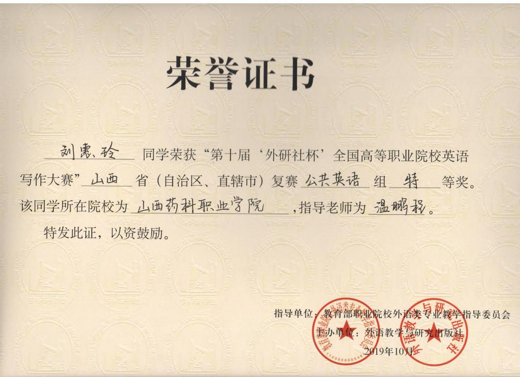近日,“外研社杯”全国高等职业院校英语写作大赛官网公布了第十届“外研社杯”全国高等职业院校英语写作大赛复赛山西赛区获奖名单,由基础部温鹏程老师指导的刘惠玲同学荣获特等奖,郭丽老师指导的段晓霞同学荣获二等奖。