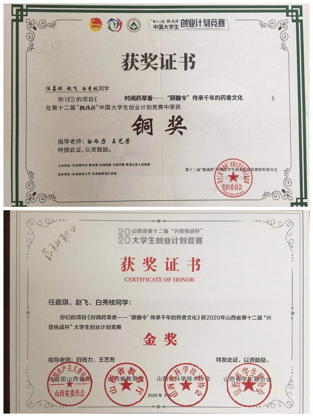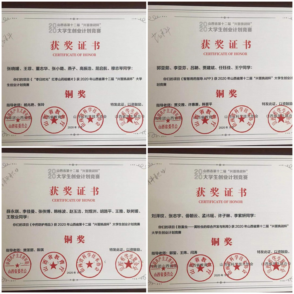 在第十二届“挑战杯”中国大学生创业大赛中,beat365报送15件作品参加省赛,荣获1个金奖,3个银奖,4个铜奖,其中由制药工程系白而力、王艺芳老师指导的参赛作品《时闻药草香-“颐馥令”传承千年的药香文化》首次入围国赛,勇夺铜奖!该项目的获奖创造了beat365参加“挑战杯”大赛以来历史最佳成绩,实现了“挑战杯”国奖零的突破。