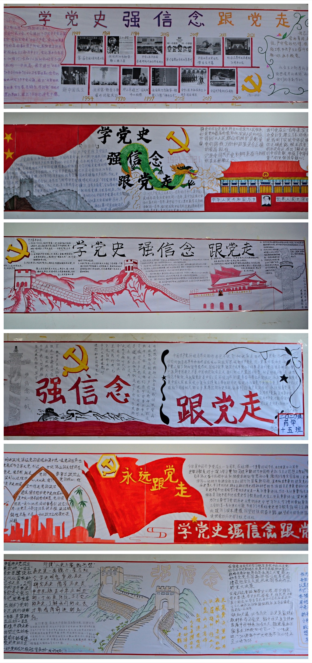 比赛中,各班学生认真负责、发挥特长,设计出了内容丰富、版面整洁,有特色、有创意的党史文化墙。一幅幅凝聚力量、鼓舞士气、催人奋进的红色图文,一句句为党立言、为国存史、为民修志的铿锵誓言,激励着全体学生时刻坚定理想信念、知党爱党永远跟党走。