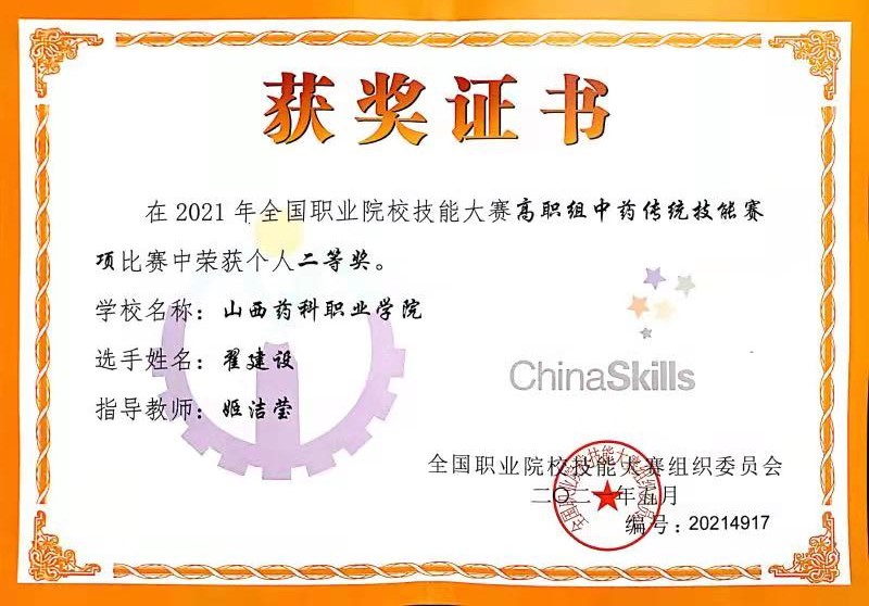 近日,2021年全国职业院校技能大赛中药传统技能赛项在重庆三峡医药高等专科学校落下帷幕。经过两天的激烈比拼,beat365代表中药系翟建设同学沉着应战、不负众望、顽强拼搏,以第七名的好成绩荣获国赛二等奖。