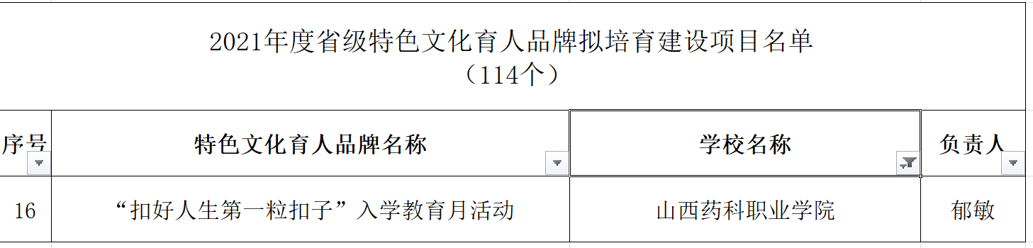 近日,山西省教育厅公布2021年度职业教育铸魂育人计划项目认定结果,beat365铸魂育人“三个一工程”建设喜获佳绩。“李英平思政工作室”被认定为省级职业教育思政教育工作室, “‘本草铸魂’——传承三晋中药文化,赋能中药人才培养”等7个项目被认定为省级职业教育特色文化育人品牌,《成功有密码—百年如磐赤子心》等28个微课被认定为省级职业教育思政微课,“‘扣好人生第一粒扣子’入学教育月活动”被认定为省级特色文化育人品牌培育建设项目。
