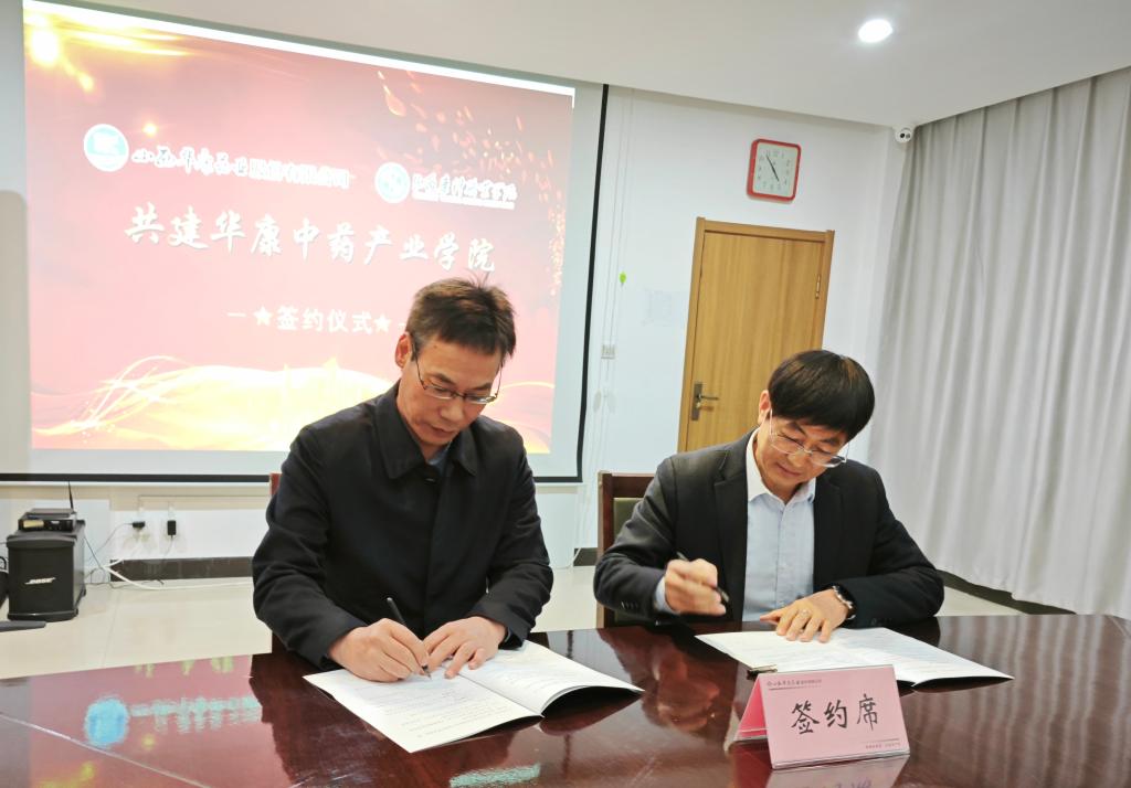 张轩萍与董光明共同为华康产业学院授牌,校企双方共同签署华康中药产业学院协议。