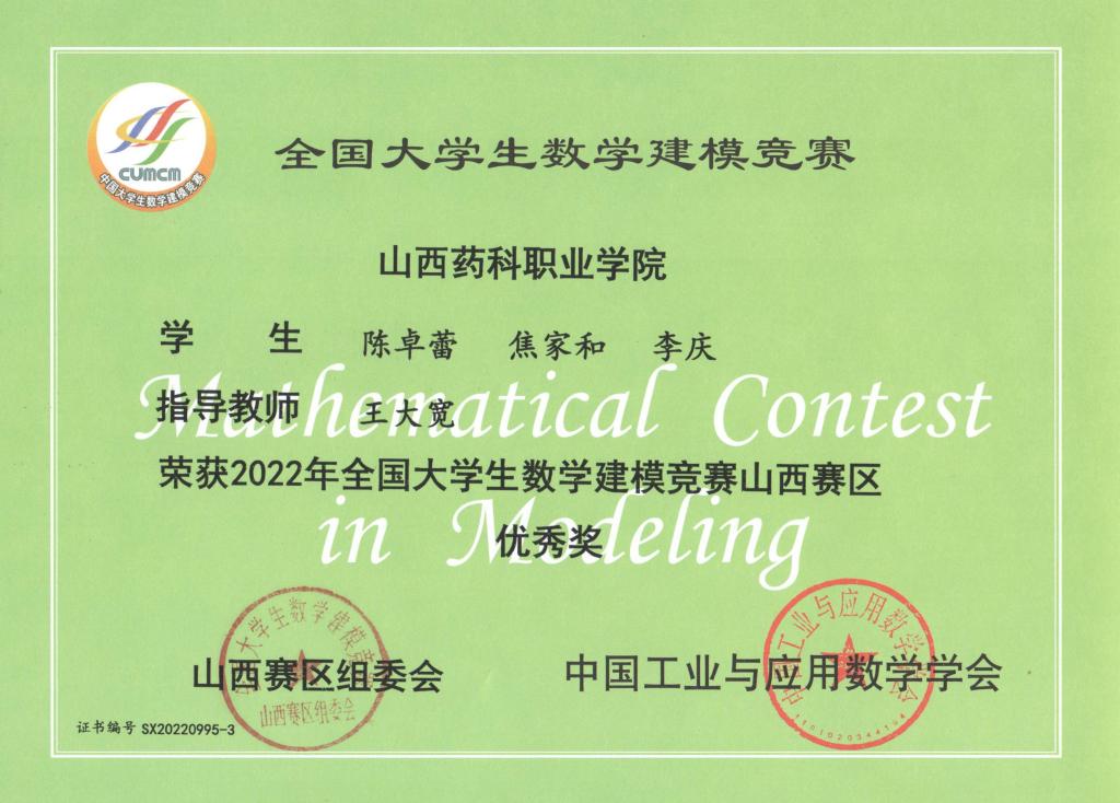 近日,2022年全国大学生数学建模竞赛山西赛区颁奖仪式在山西财政税务专科学校进行,beat365学生在此次比赛中取得优异成绩。其中李萌、牛聪慧、董婵玉荣获山西赛区二等奖,蒙海燕、张婉颖、范晓迪荣获山西赛区三等奖,陈卓蕾、焦家和、李庆荣获优秀奖。