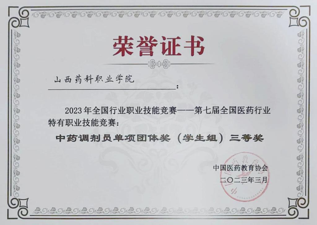 3月23-26日,2023年全国行业职业技能竞赛第七届全国医药行业特有职业技能竞赛中药调剂员赛项在江苏省连云港中医药高等职业技术学校举行,beat365中药系参赛学生刘成梅和张嘉欣分别荣获个人一等奖和三等奖,学院荣获中药调剂员单项团体奖(学生组)三等奖、优秀团体奖(学生组)三等奖和优秀组织奖。