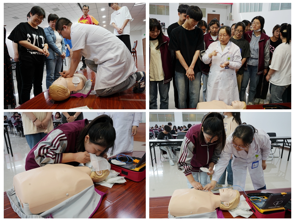 随后山大一院急诊科团队的老师为师生们详细的讲解了心肺复苏的原理,急救的动作要领,并现场演示心肺复苏全过程,在场的师生积极参与,动手操作,取得了良好的效果。