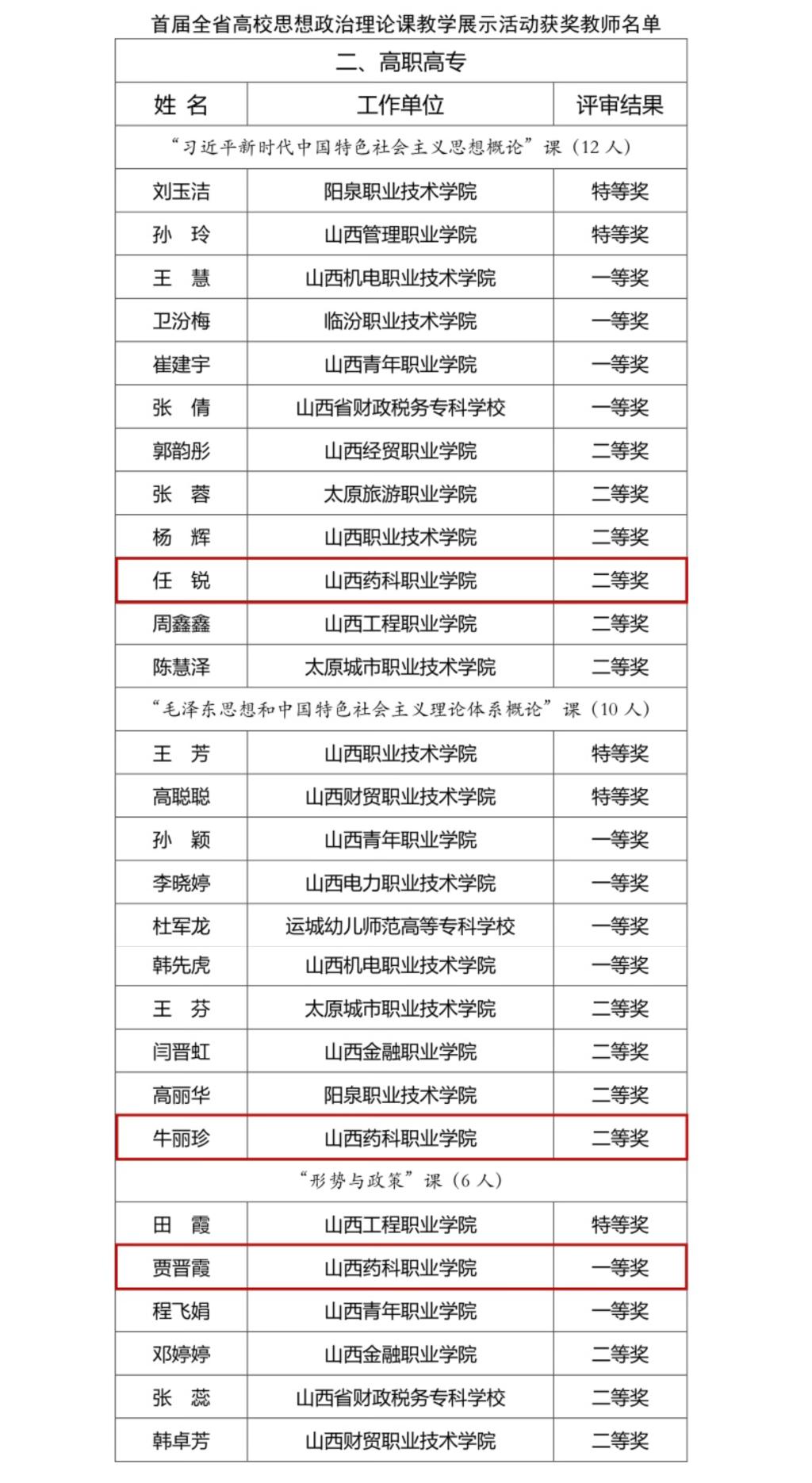 为深入学习贯彻习近平新时代中国特色社会主义思想和党的二十大精神,深化高校思政课改革创新,近日,山西省教育厅举办了首届全省高校思想政治理论课教学展示活动,经各高校推荐申报、专家初评、现场教学展示评审、结果公示等环节,beat365思政部教师贾晋霞获“形势与政策”课一等奖、任锐获“习近平新时代中国特色社会主义思想概论”课二等奖、牛丽珍获 “毛泽东思想和中国特色社会主义理论体系概论”课二等奖。