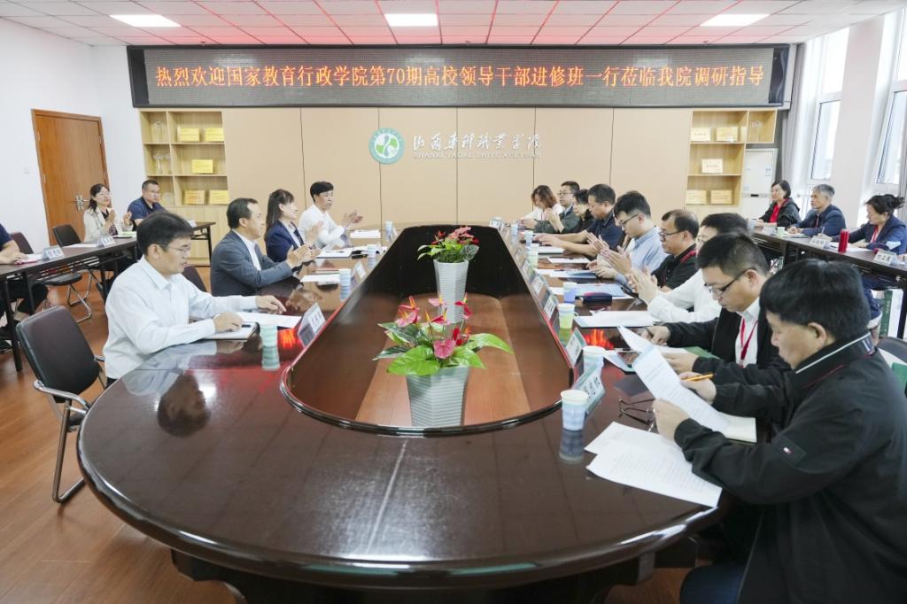 座谈会上,王旭代表学院对进修班调研团一行莅临指导表示热烈欢迎,向国家教育行政学院和各兄弟单位对学院工作的支持表示衷心感谢。他表示,学院1957年建校至今,在不同历史时期的办学过程中,始终坚守为党育人、为国育才,始终高举“振兴中药”的旗帜,始终恪守“修德济世,精业立身”的校训和秉持“百草精神”,为山西乃至全国医药行业培养了一大批“用得上、留得住、干得好”的技术技能人才。新一届学院党委坚持以高质量党建提升工程为引领,以建设全国一流药科职业院校为目标,科学谋划符合学院发展实际的“1339”行动方案,统筹推进学院各项事业改革发展,完成了部分硬件设施建设改造,优化了人才培养专业布局,构建了“三全育人”工作体系,创新了产教融合育人模式,实现了管理效能转型升级,学院面貌、师生风貌焕然一新。王旭表示,希望以此次佛朝晖教授带队考察指导为契机,开启山西药科和国家教育行政学院合作的新模式,开启山西药科和来自全国的兄弟院校合作的新起点,共同为教育强国建设贡献职教力量。