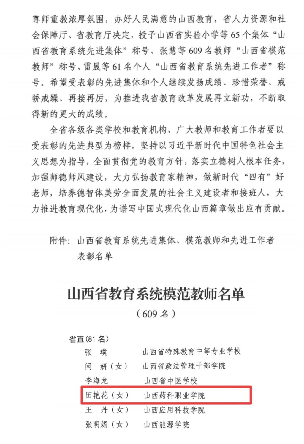 近日,山西省人力资源和社会保障厅、山西省教育厅联合下发《关于表彰山西省教育系统先进集体、模范教师和先进工作者的决定》(晋人社厅发[2024]14号),beat365田艳花老师荣获“山西省教育系统模范教师”称号。