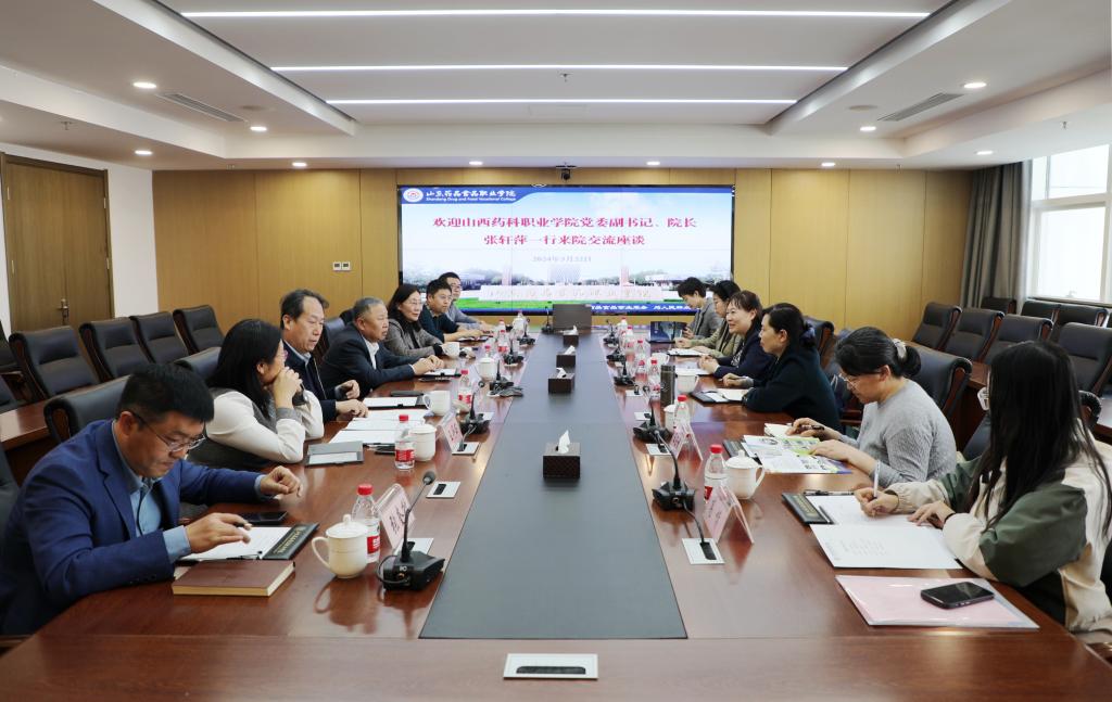 在山东药品食品职业学院,张轩萍一行参观了药品技术、医疗器械、药品质量检测、食品检测、中药学等专业实践教学基地以及省级大学生创新创业基地,双方围绕提质创优办学条件、优化师资队伍建设、强化学生管理等进行了深入探讨,并就进一步加强交流合作,共同推动两校职业教育高质量发展达成共识。