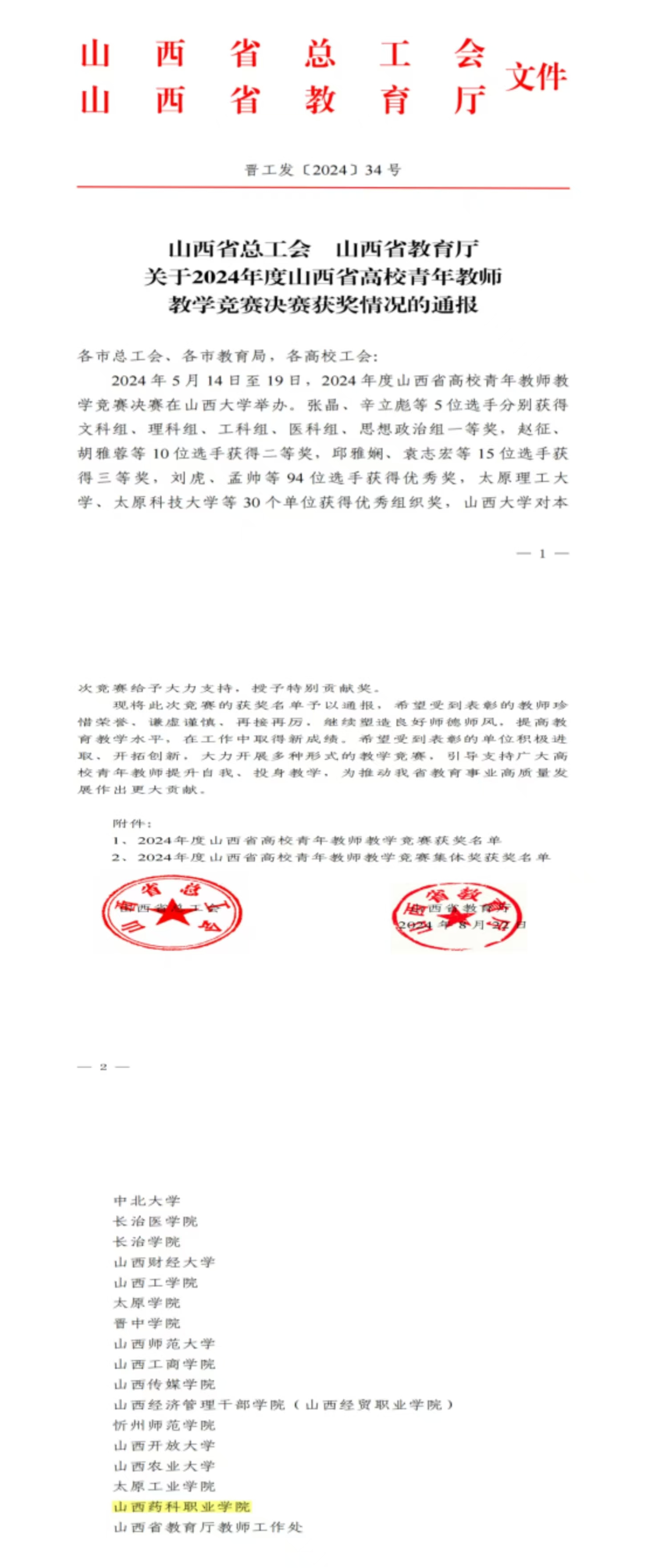 近日,山西省总工会与山西省教育厅共同发布《关于2024年度山西省高校青年教师教学竞赛决赛获奖情况的通报》,beat365荣获优秀组织奖。