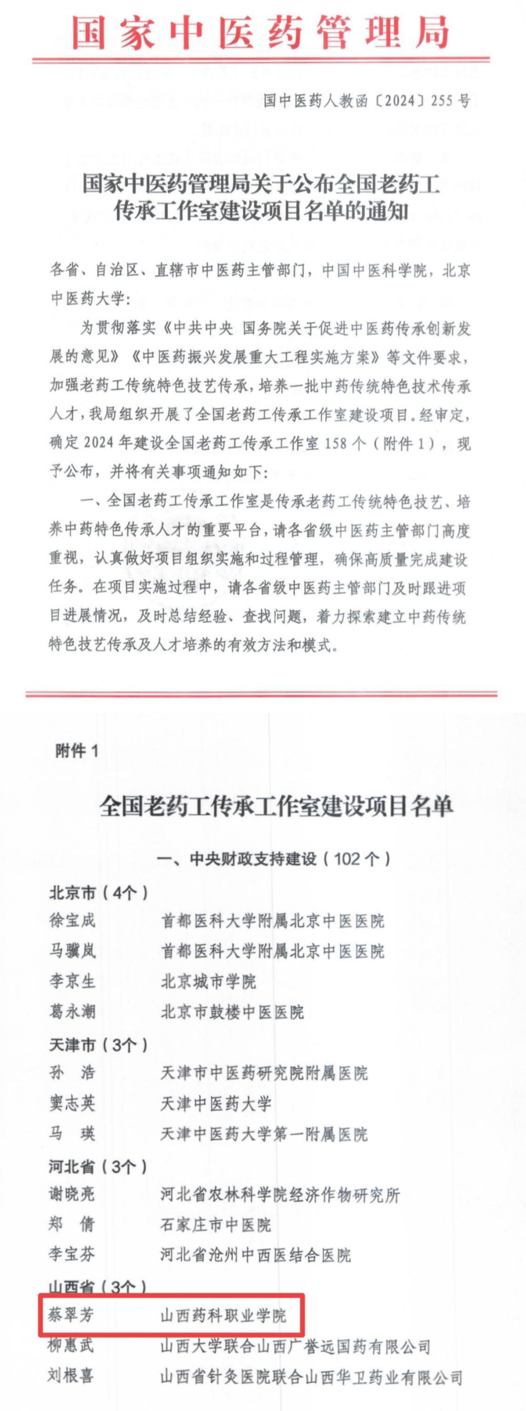 日前,国家中医药管理局公布2024年全国老药工传承工作室建设项目名单,来自全国各省市区共计158个建设项目获批,其中山西省获批3项,beat365“蔡翠芳老药工传承工作室”成功入选。