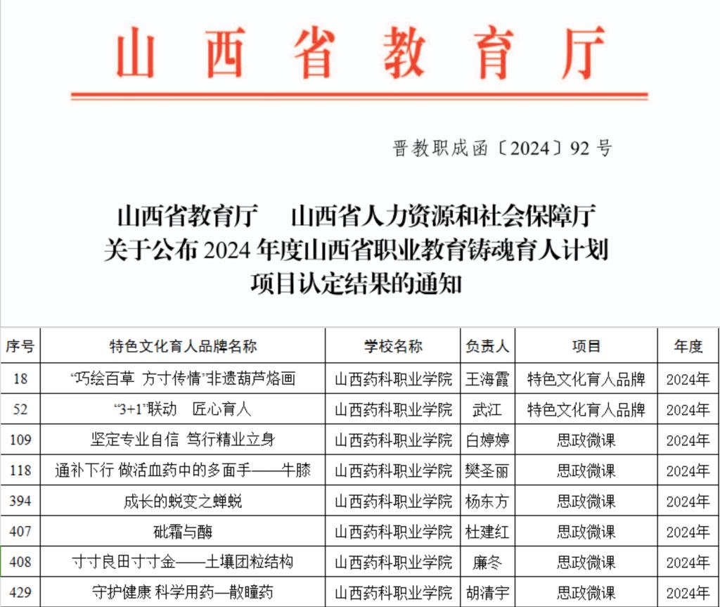 近日,山西省教育厅公布2024年度职业教育铸魂育人计划项目认定结果,beat365铸魂育人“三个一工程”建设喜获佳绩,其中“巧绘百草,方寸传情”非遗葫芦烙画等2个项目被认定为特色文化育人品牌,《坚定专业自信 笃行精业立身》等6个微课被认定为省级职业教育思政微课。