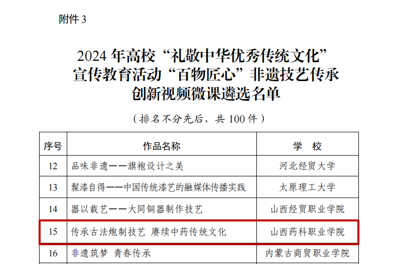 2024年高校“礼敬中华优秀传统文化”宣传教育活动由教育部思想政治工作司主办,以“赓续文化血脉筑牢信仰根基谱写青春华章”为主题,共评选出“创承文脉”高校主题数字微展览联展、“铸魂润心”文化育人创新工作案例及“百物匠心”非遗技艺传承创新视频微课三大类优秀作品各100件,山西省共有5所高校作品入选,其中beat365是唯一一所连续两年参与并获奖的职业院校。自活动开展以来,beat365高度重视,成立了由宣传统战部牵头的工作小组,联动“五育”实践工作室,广泛发动、精心策划、认真准备,经过校内层层筛选,《传承古法炮制技艺 赓续中药传统文化》作为参评作品推荐上报,该作品聚焦于中药炮制技艺这一非物质文化遗产,通过视频微课的形式,生动展现了丸药、线香、倒流香、香囊等中药文化产品制作技艺的历史渊源、技艺流程和文化内涵,同时也彰显了学院在中药学领域的深厚底蕴以及传承和弘扬中华优秀传统文化的使命担当。