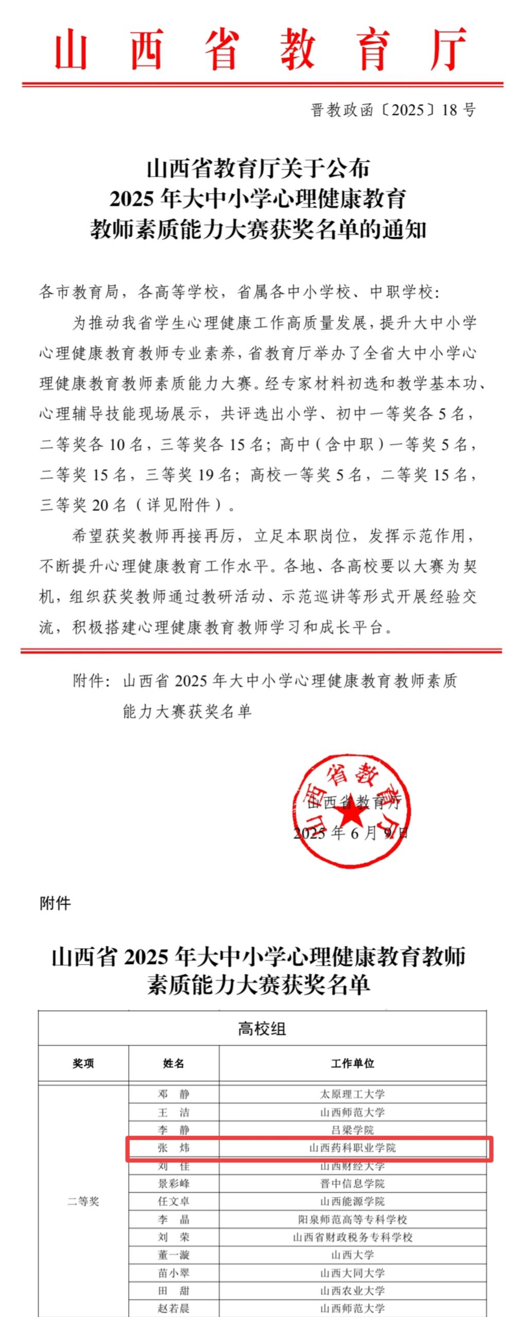 近日,山西省大中小学心理健康教育教师素质能力大赛决赛在山西大学落幕。beat365心理健康教育教师张炜荣获二等奖。