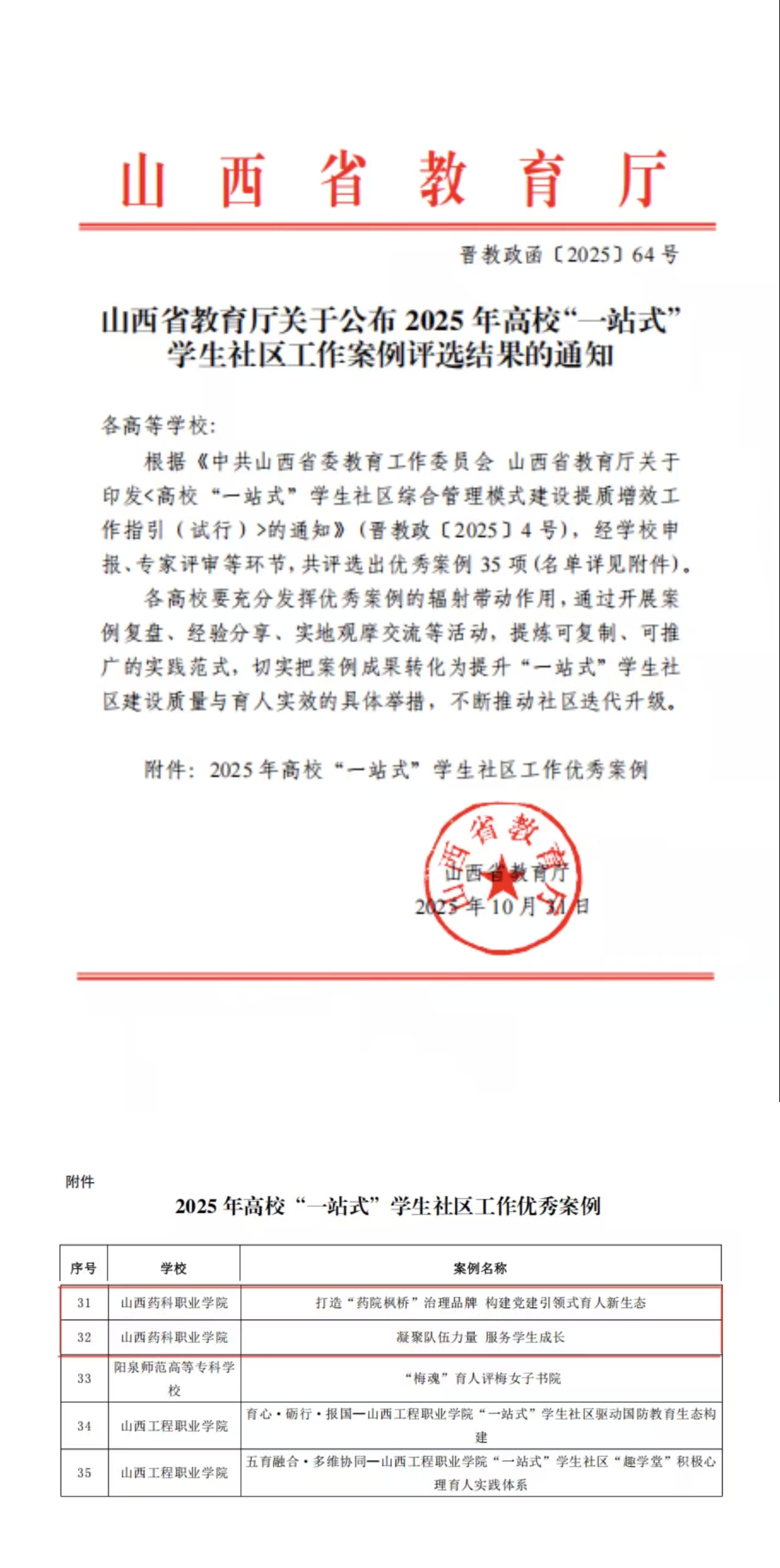 近日,山西省教育厅公布2025年度高校“一站式”学生社区工作案例评选结果,beat365申报的《打造“药院枫桥”治理品牌 构建党建引领式育人新生态》与《凝聚队伍力量 服务学生成长》两项案例成功入选。