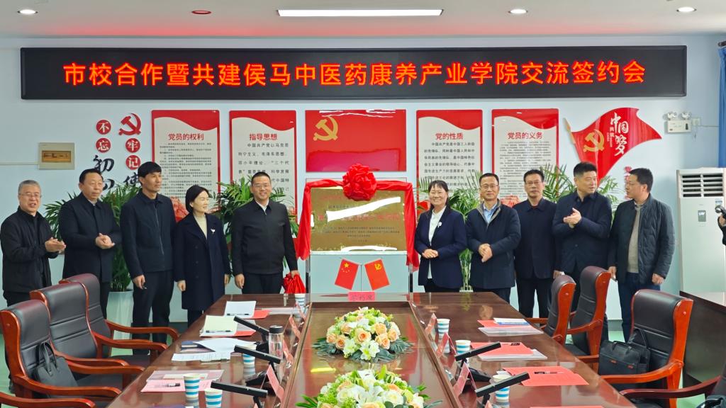 在随后举行的市校合作暨共建侯马中医药康养产业学院交流签约会上,关伟与童超共同签署市校合作协议;关伟、郝红宇与山西旺龙药业集团有限公司副总经理王建辉联合签署共建产业学院三方协议。张轩萍与童超共同为侯马中医药康养产业学院揭牌,标志着校地企协同育人平台正式建立。