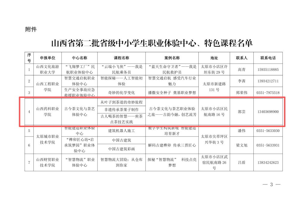 近日,山西省教育厅公布了第二批省级中小学生职业体验中心、特色课程和优秀案例名单,beat365食品系申报的“药·茶技能技艺传承与创新实训基地”成功入选。其中,“古今茶文化与茶艺体验中心”获批省级职业体验中心,3门课程获评省级特色课程,1项成果入选省级优秀案例,标志着食品系在茶文化传承、技能育人与职业体验建设方面取得重要阶段性成果。