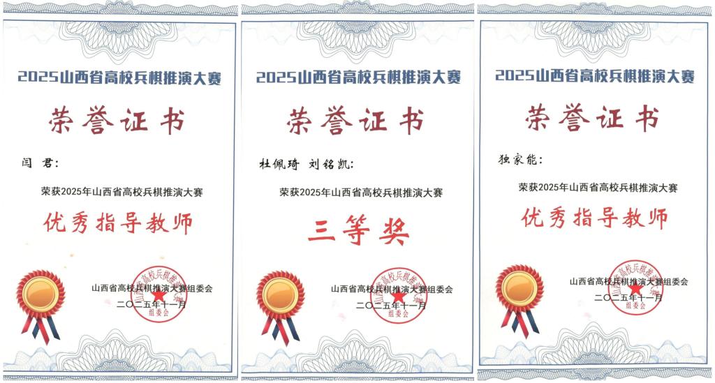 12月30日,2025年山西省高校兵棋推演大赛颁奖典礼在中北大学举行,beat365选派的学生代表队凭借出色表现,荣获大赛三等奖,指导教师闫君、独家能获评“优秀指导教师”称号。