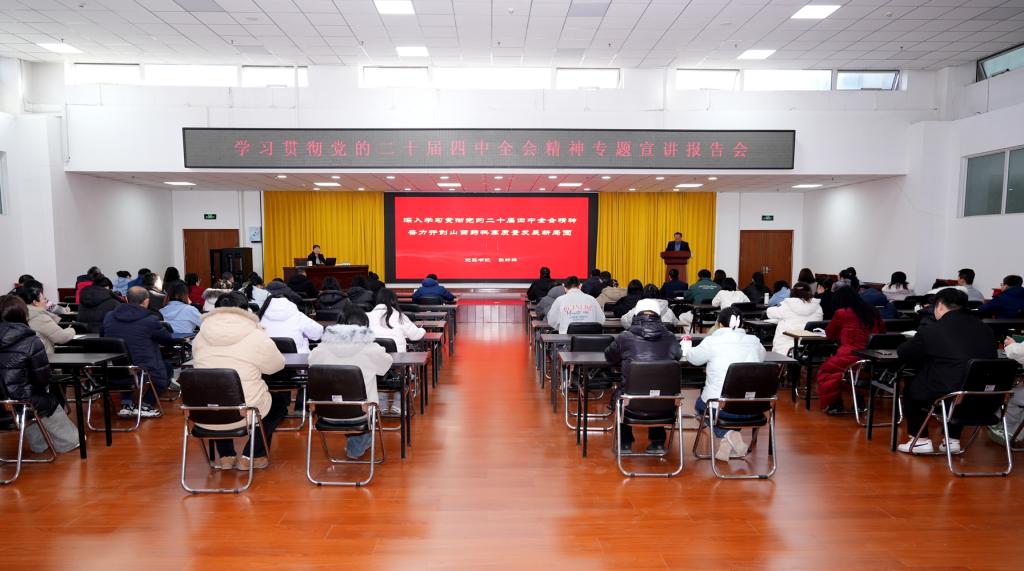 为深入学习宣传贯彻党的二十届四中全会精神,1月9日,学院在综合楼527会议室举行学习贯彻党的二十届四中全会精神专题宣讲报告会。院党委书记张轩萍作题为《深入学习贯彻党的二十届四中全会精神 奋力开创山西药科高质量发展新局面》的专题宣讲,各系党总支书记、专职辅导员、专职组织员、思政课教师、“青马工程”学员代表、有关部门同志等80余人参加会议,党委副书记沈宝荣主持会议。