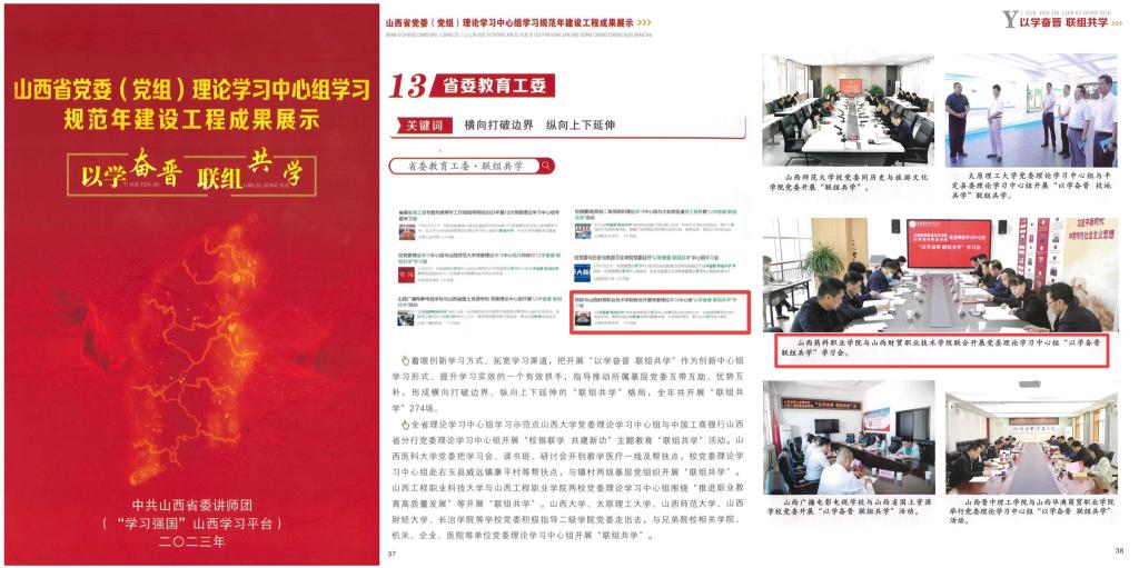 近日,山西省委宣传部印发“以学奋晋 联组共学”——山西省党委(党组)理论学习中心组学习规范年建设工程成果展示宣传册,beat365党委理论学习中心组组织开展的“以学奋晋 联组共学”学习会作为典型示范编入其中。