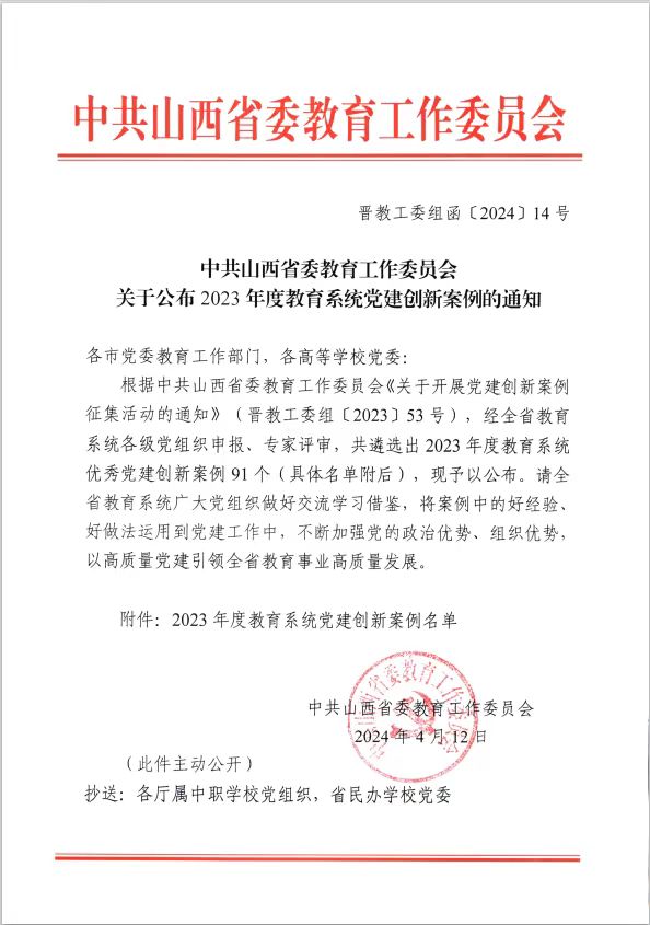 此次党建创新案例征集活动由省委教育工委统一组织,全省教育系统大中小学校各级党组织积极参与申报,经专家评审,共评选出主题突出、鲜活生动、示范性强的党建创新案例91个。在此次党建创新案例征集中,院党委精心组织,周密部署,优中选优,凝练形成了富有特色和成效的党建工作创新案例,充分发挥了先进典型的示范引领作用。