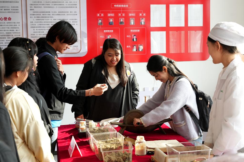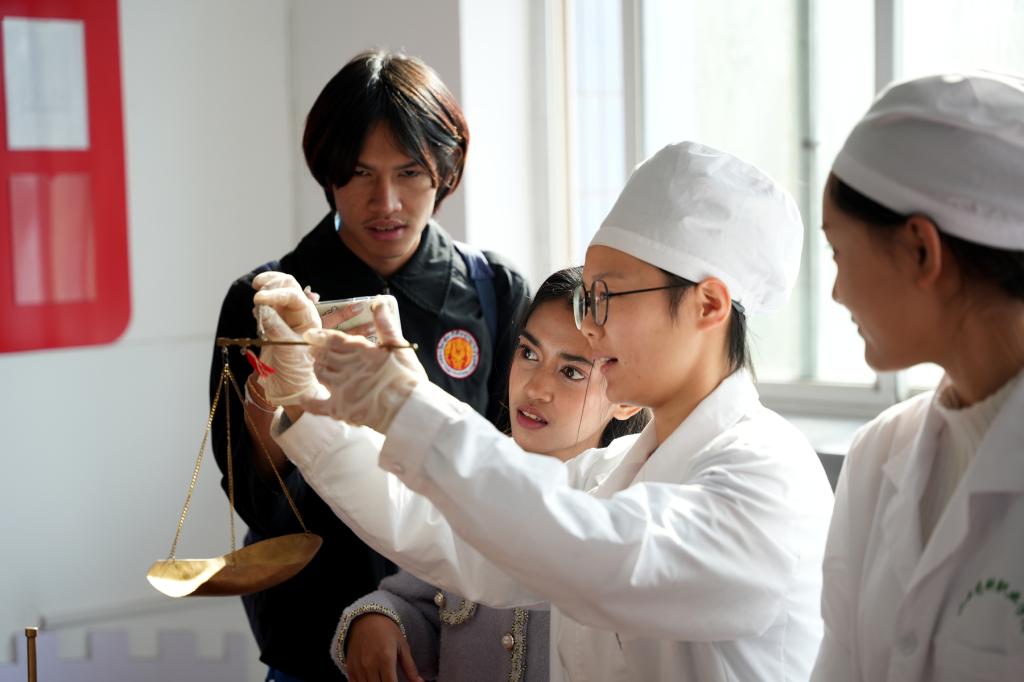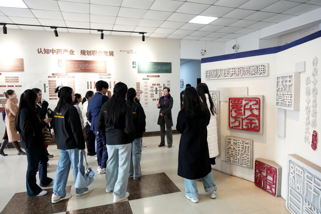 泰国师生实地参观了中药标本厅、中药调剂技艺传承基地、百草大药房、药・茶技能技艺传承与创新实训基地以及传统文化教育学习室等一系列极具中华文化底蕴的育人场所,beat365讲解员为其详细介绍了中医药文化的丰富内容和深厚内涵,使其对我国中药传统文化、中医传统调剂技艺以及传统茶文化有了更为直观和深刻的理解。