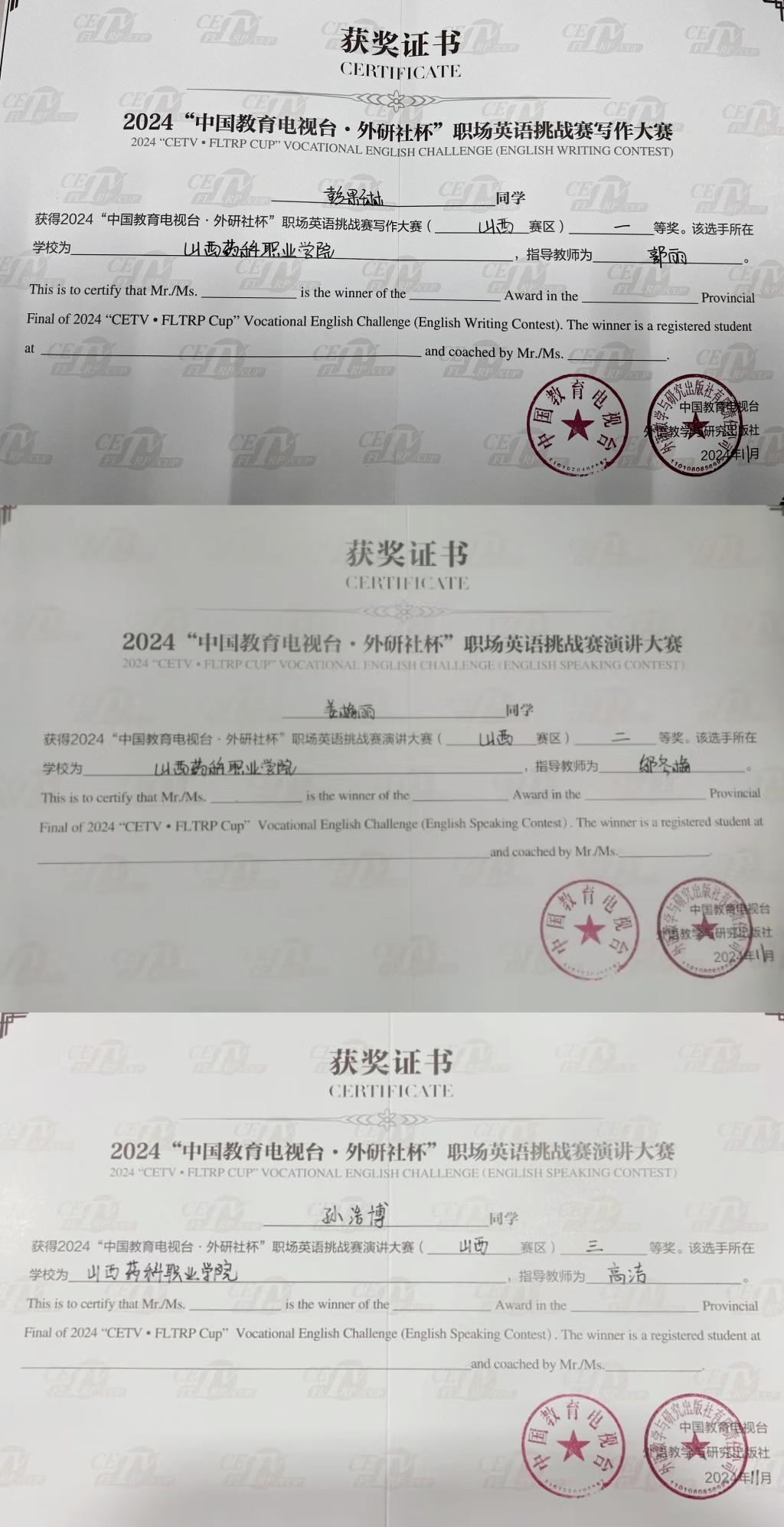 近日,2024“中国教育电视台·外研社杯”职场英语挑战赛山西省赛落下帷幕,beat365学生载誉而归。2023级药学6班学生彭果琳荣获写作大赛一等奖,2023级药学11班学生姜梅丽、2023级药学8班学生孙浩博分别荣获演讲比赛二等奖、三等奖。