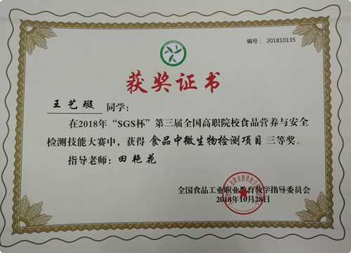 近日,2018年“SGS杯”第三届高职院校全国食品营养与安全检测技能大赛在广东轻工职业技术学院落下帷幕,beat365学生王艺璇荣获食品中微生物检测项目三等奖。2018-11-05 -