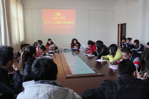 2012年11月28日下午,食品工程系学习十八大心得交流会在西教学楼一层会议室举行,系全体教职工、入党积极分子代表、学生代表等参加交流会,系党总支副书记郁敏主持会议。 会上,党员干部和教师重点就如何将十八大精神...2012-11-29 -